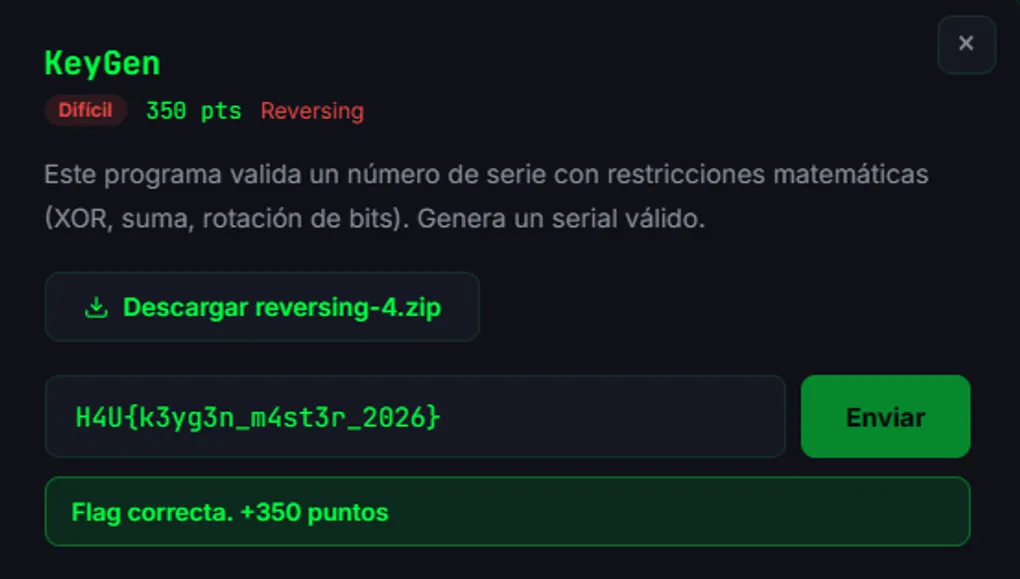 Este programa valida un número de serie con restricciones matemáticas (XOR, suma, rotación de bits). Genera un serial válido.