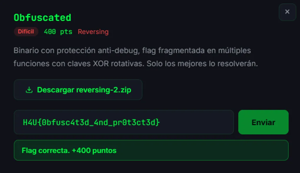 Binario con protección anti-debug, flag fragmentada en múltiples funciones con claves XOR rotativas. Solo los mejores lo resolverán.