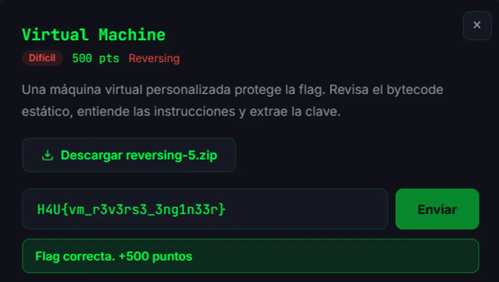 with open("reversing5variable.txt", "r") as f: lines = [linea.rstrip('\n') for linea in f.readlines()] flag = "" vytes = "".join(lines).split(" ") for vyte in vytes: if not (vyte == "06" or vyte == "01" or vyte == "02" or vyte == "03" or vyte == "04" or vyte == "05" or vyte == "00" or vyte == "aa"): xor = int(vyte, 16) ^ 0xaa flag += chr(xor) print(flag[:-1])Como lo que me interesa es obtener los valores con los ^ 0xaa, lo que hice fue simplemente obviar las instrucciones, los bytes nulos y el valor de 0xaa (no usé regex porque no me acordaba cómo hacerlo en Python), y solo se le hizo XOR a los valores que interesan. Al final le quito el último carácter, porque se me cuela un carácter: el de 0xff, que está al final del hex.